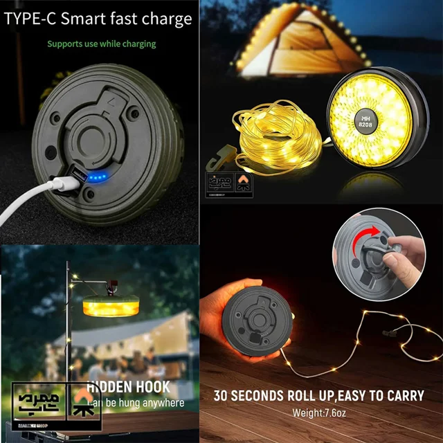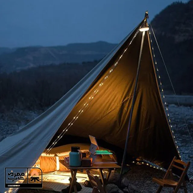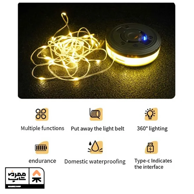چراغ چادر ریسهای شارژی 8208 مناسب برای داخل چادر و فضای کمپینگ با نوردهی ملایم و گرم ، دارای باطری قابل شارژ ، طراحی ریسه ای ، سبک و قابل حمل ایده آل برای سفر و طبیعت گردی است.